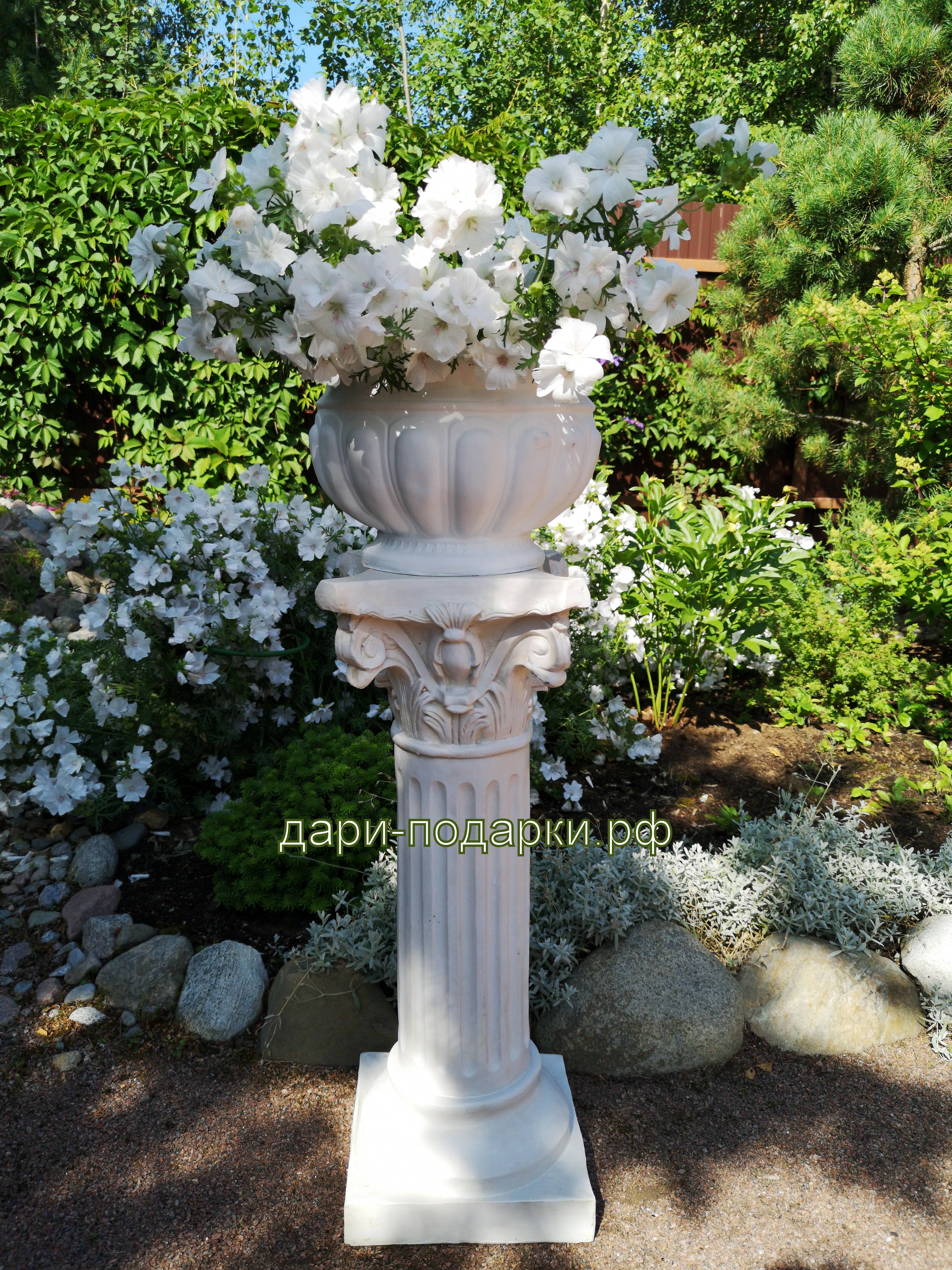 Античная колонна изготовлена русскими мастерами из современного экологичного материала - полистоуна. Полистоун — это искусственный камень, состоящий из акриловых смол, гидроксида алюминия, измельченного натурального камня, пигментов и других добавок. Полистоун не боится влаги и перепадов температур, поэтому фигуры из полистоуна прекрасно украсят Ваш дом и участок, а так же будут радовать Вас долгое время своей красотой
