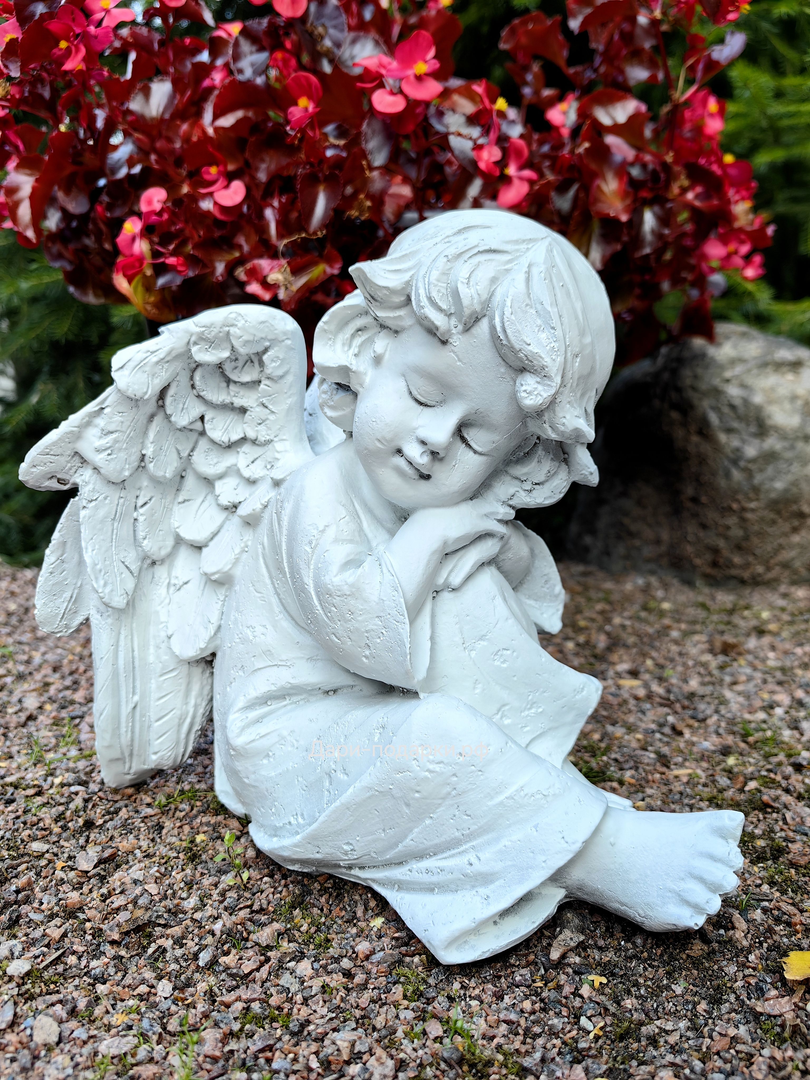 Садовая фигура изготовлена русскими мастерами из современного экологичного материала - полистоуна. Полистоун — это искусственный камень, состоящий из акриловых смол, гидроксида алюминия, измельченного натурального камня, пигментов и других добавок. Полистоун не боится влаги и перепадов температур, поэтому фигуры из полистоуна прекрасно украсят Ваш дом и участок, а так же будут радовать Вас долгое время своей красотой.